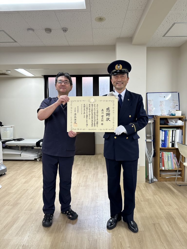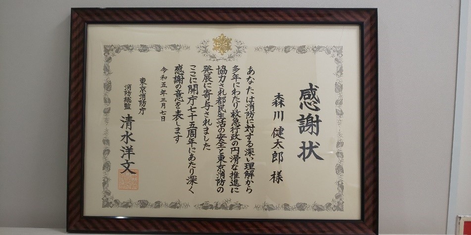 令和5年3月、当院病院長 森川 健太郎は東京消防庁消防総監より、「救急業務協力者」として感謝状を受けました。消防に対する深い理解から多年にわたり救急行政の円滑な推進に協力し、都民生活の安全と東京消防の発展に寄与されたとしての表彰です。当院としては、この度は評価していただいた事を真摯に受け止め、今後も、救急患者様の受け入れに努めて参る所存です。